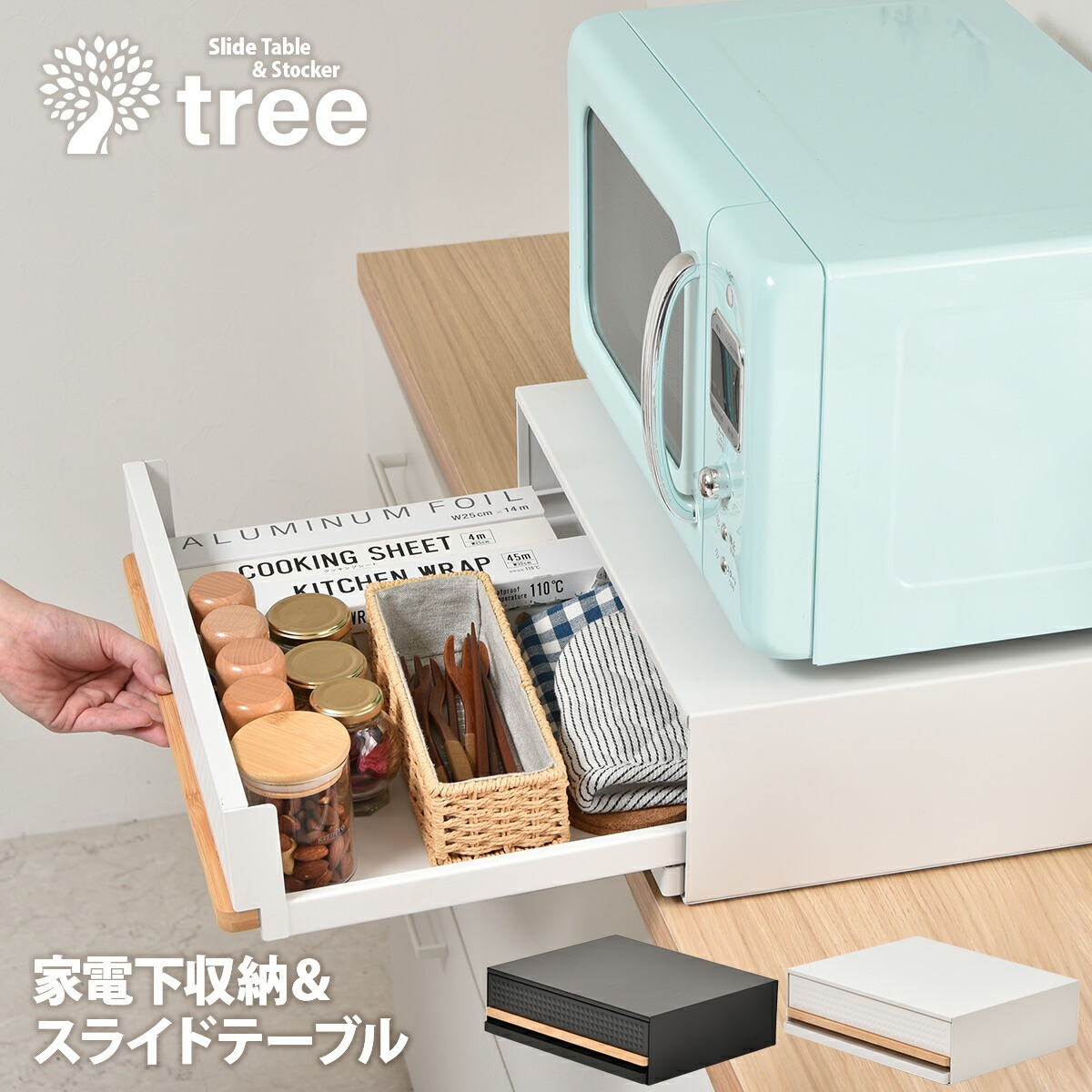 TREE キッチン家電下収納&スライドテーブルは、小物を収納できる引き出しとスライドテーブルが1つになった便利な調理家電下ラック。手狭なキッチンでも、電子レンジやトースターの下に置くだけで便利なワークスペースができるので、家事効率がグンとアップします。天板耐荷重は約17kgで、オーブンレンジの下にも設置可能。上段は小物を収納できる便利な引き出し付き。ラップや小物、カトラリー類を収納可能。空間を上手に利用して、ゆとりのスペースで日々のお料理も手早く快適です。 |