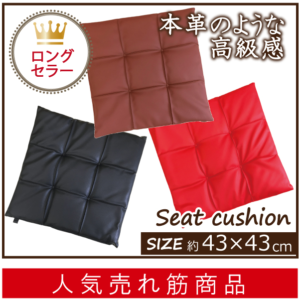 高級感があり、お洒落を演出できるフェイクレザーのシートクッションです。当店の人気商品の中でも、シートクッションでは群を抜く売れ行きで、生産が追いつかないこともあります。