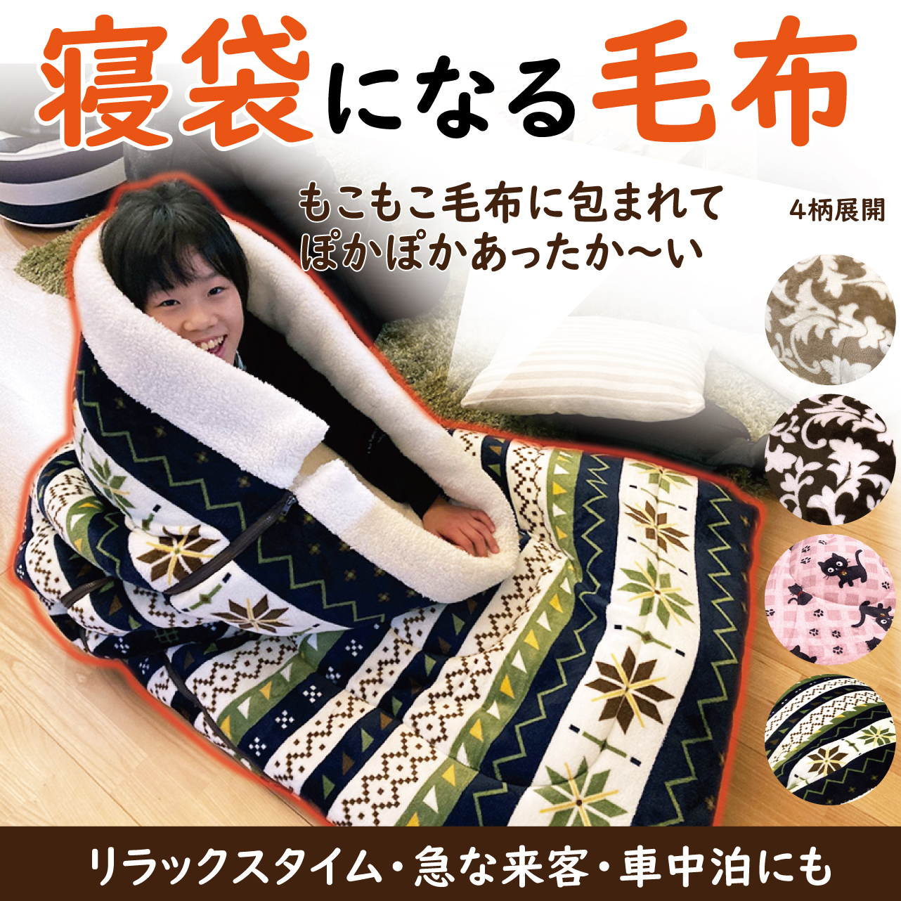 筒形に寝袋になる毛布です。