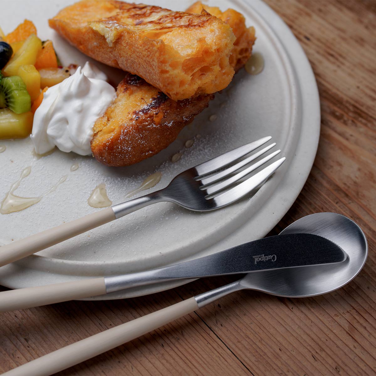 Cutipolカトラリー2019年の新作MIOシリーズはエレガントでソフトな曲線が特徴で柔らかい印象のカトラリーです。適度なヘッドの重み、木製のようですべりにくいさらっとした樹脂の持ち手が絶妙なバランスで設計されており、誰もが使いやすさを実感できます。ナチュラルテイストのアイボリーカラーは、ウッド調のテーブルやお皿とも相性がよく温かい雰囲気を出してくれます。