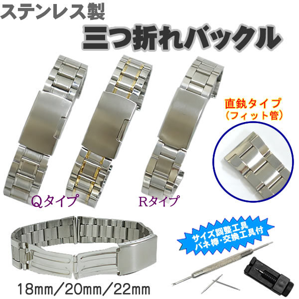時計ベルト 三つ折りバックルタイプ ステンレス製 バネ棒・交換工具・サイズ調整工具付き 18mm 20mm 22mm メンズ レディース