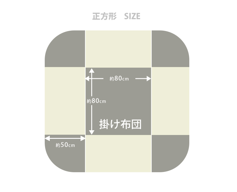 (約)75〜80×75〜80×高さ50cmのこたつ本体サイズに適しています。