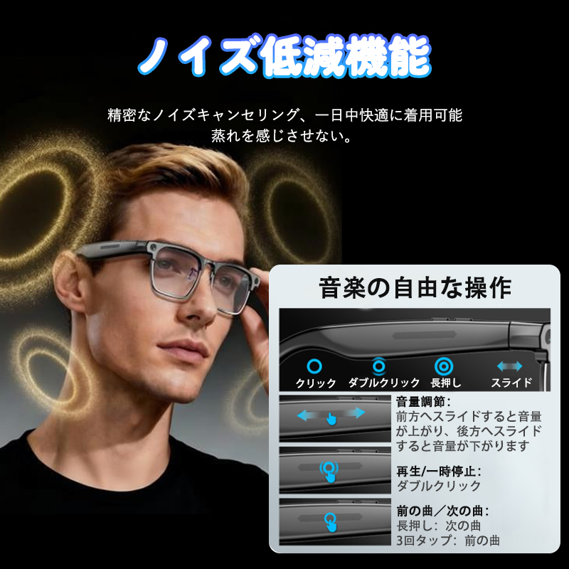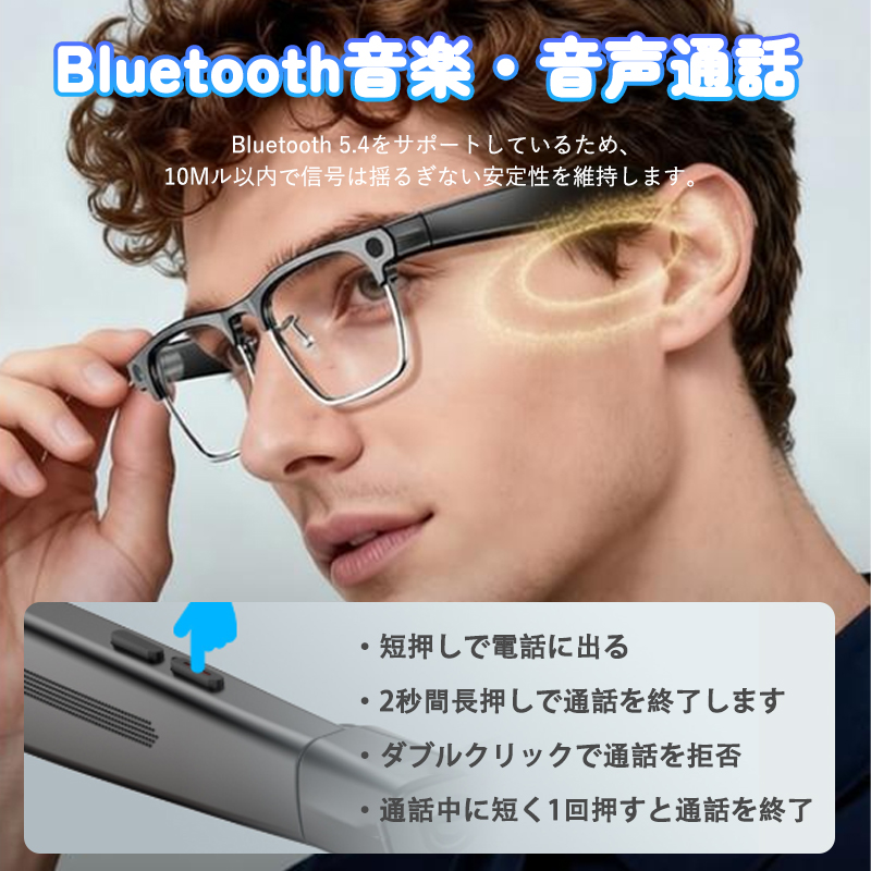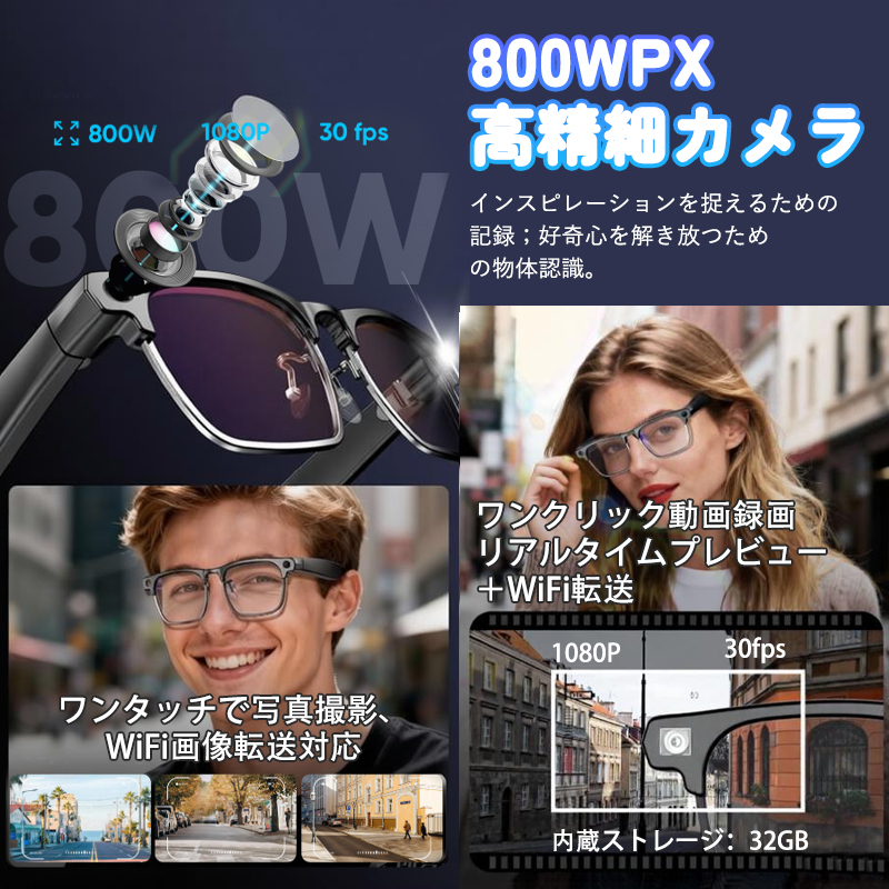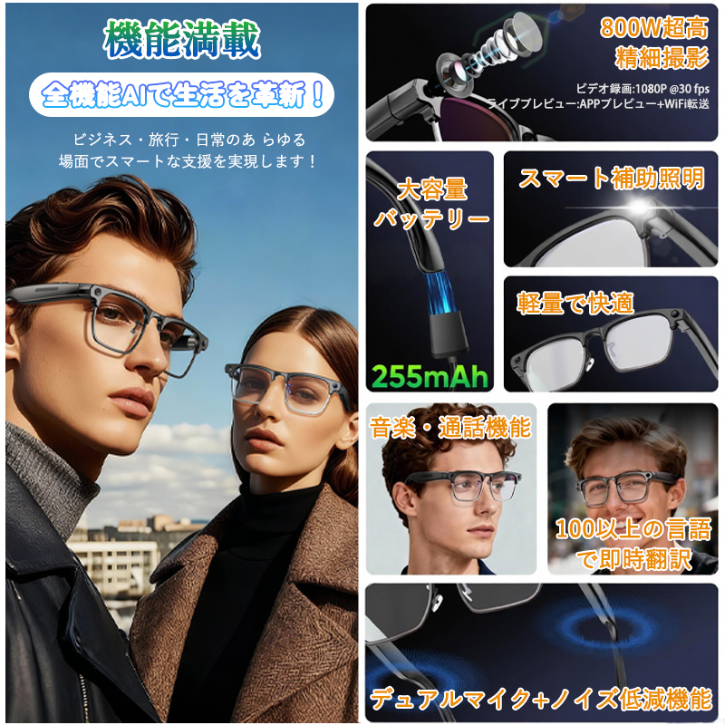最新 Bluetooth5.4 を搭載した多機能スマートグラスです。800 万画素の高画質カメラで写真・動画を撮影しながら、ハンズフリーで通話や音楽を楽しめます。わずか 47g の超軽量設計で長時間装着しても疲れにくく、AI 機能でスマートな生活をサポートします。