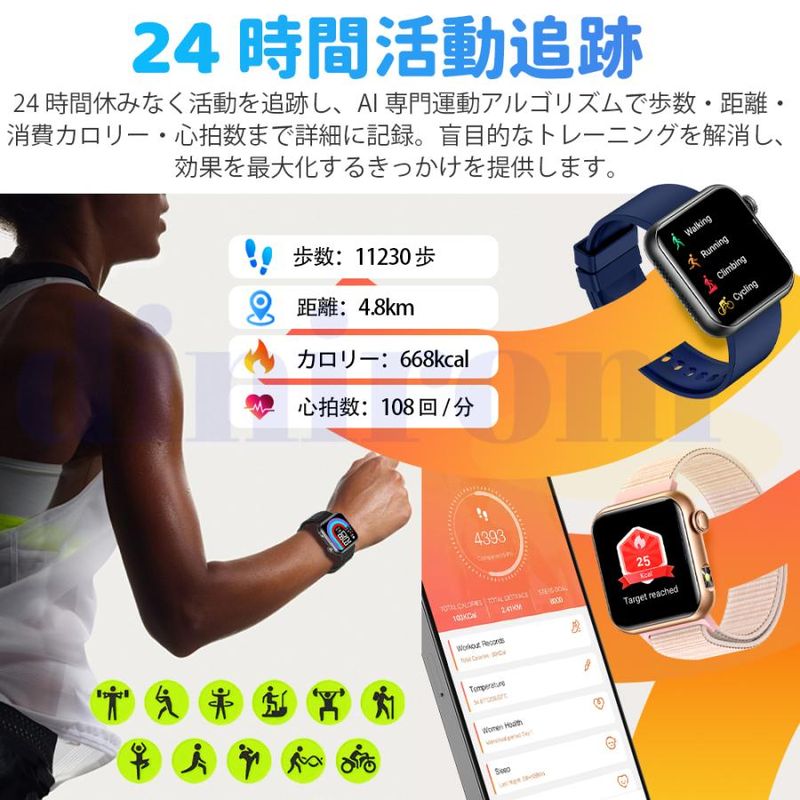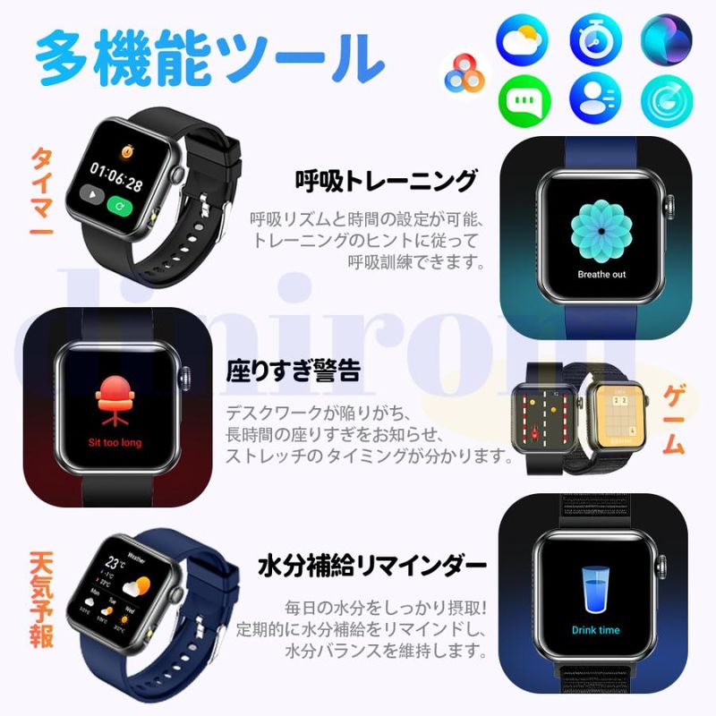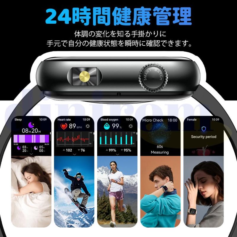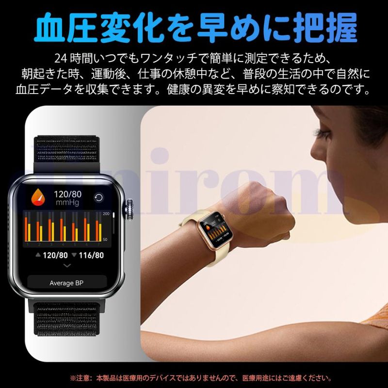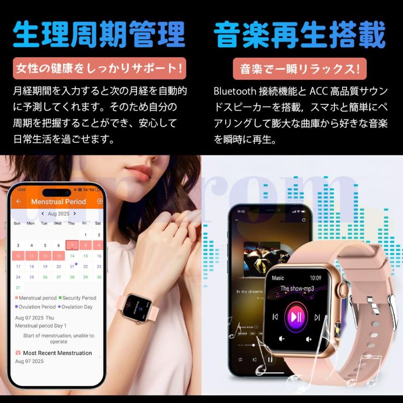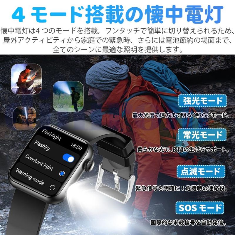 毎日の歩数や距離、カロリーを記録するだけでなく、懐中電灯、座りがち注意、飲水注意、薬を飲む注意リラックス、睡眠質を記録などの機能も備えています。女性の健康のために、女性の月経周期の記録と通知機能も揃えます。スタイリッシュなデザインは職場や生活の中でレディースもメンズも使用いただけます。スマホ探す、リモコン撮影 、アラーム、タイマー、ストップウォッチ、腕上げ点灯、画面の明るさ調整、おやすみモード、天気予報、音楽コントロール、多言語対応などの便利機能が満載!IP68規格の防水&防塵性能を持ち、日常生活での手洗いや洗顔の際に取り外す必要がありません。注意:ダイビングや海水浴、サウナでの使用は避けてください。