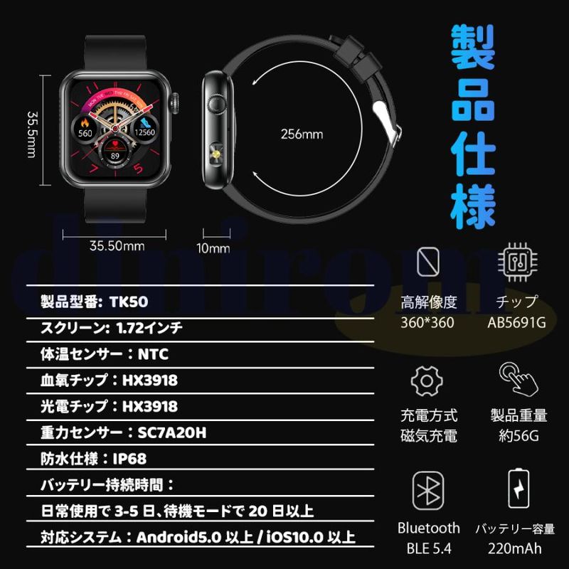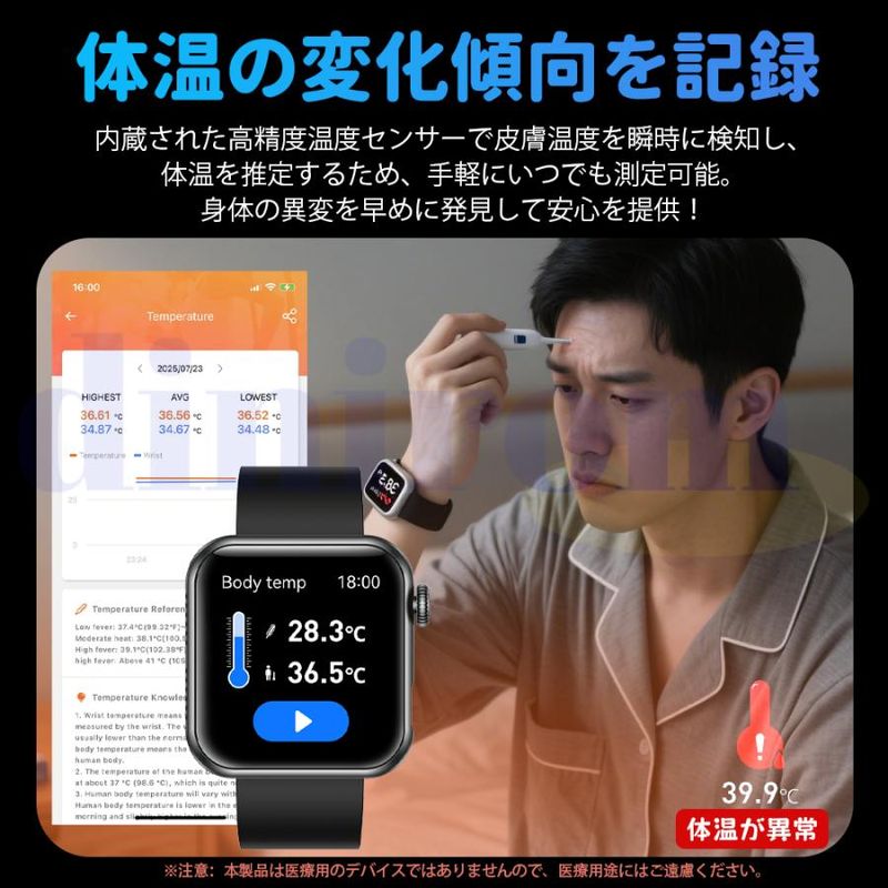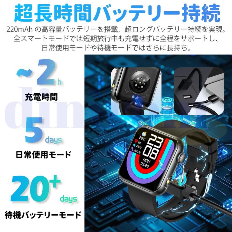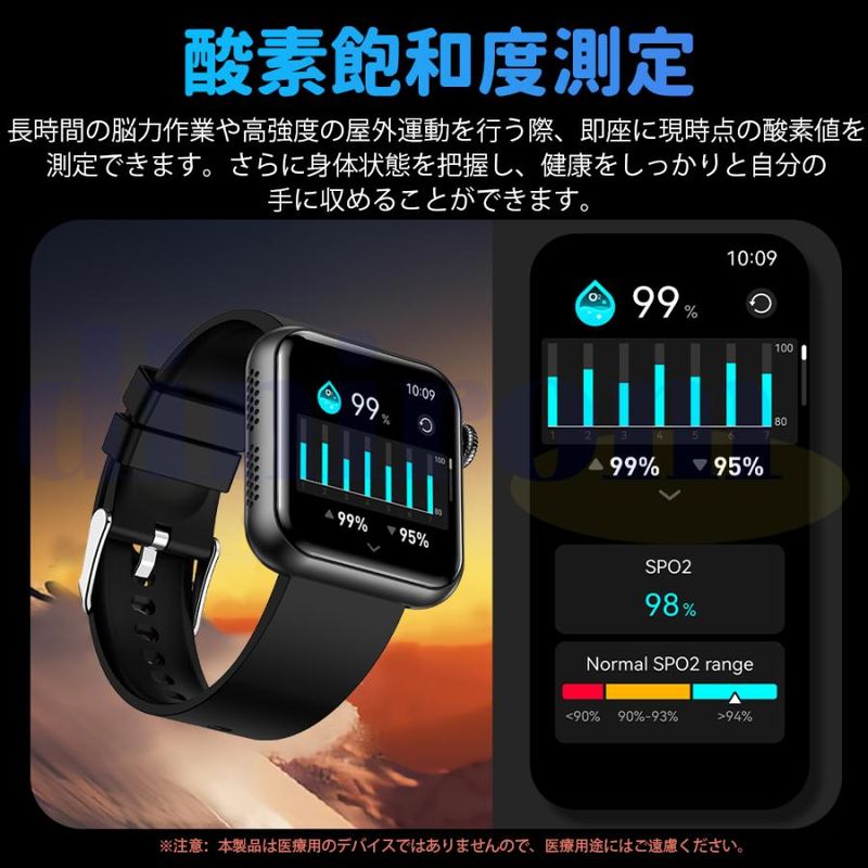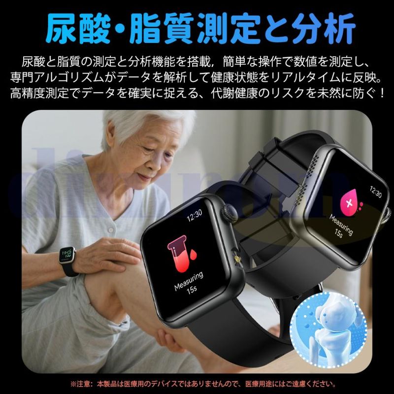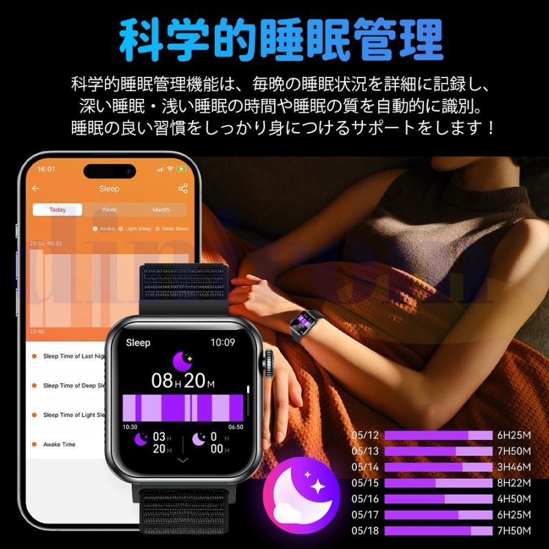 毎日の歩数や距離、カロリーを記録するだけでなく、懐中電灯、座りがち注意、飲水注意、薬を飲む注意リラックス、睡眠質を記録などの機能も備えています。女性の健康のために、女性の月経周期の記録と通知機能も揃えます。スタイリッシュなデザインは職場や生活の中でレディースもメンズも使用いただけます。スマホ探す、リモコン撮影 、アラーム、タイマー、ストップウォッチ、腕上げ点灯、画面の明るさ調整、おやすみモード、天気予報、音楽コントロール、多言語対応などの便利機能が満載!IP68規格の防水&防塵性能を持ち、日常生活での手洗いや洗顔の際に取り外す必要がありません。注意:ダイビングや海水浴、サウナでの使用は避けてください。