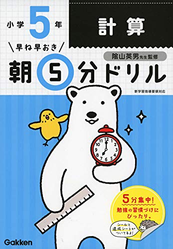 ~朝の勉強で、頭のスイッチが入る かしこい子に育つ習慣づけに~ 1日たったの5分だから続けやすい 朝の短い時間でも取り組めるように、1日分はたったの5分。スキマ時間の活用や、基礎固めにもオススメです。 やさしく学べる 例題がついているので、解き方がしっかりわかります。毎日コツコツ続けやすい、5分で解ける問題数です。 規則正しい生活習慣が身につく 毎日の睡眠時間や勉強時間を記録できる「生活チェック」つき 自分の生活を振り返ることで、規則正しい生活習慣が身につきます。 達成シート&シールつきで毎日がんばれる ドリルが1回終わるごとに、達成シートにシールを貼っていきます。どこまで進んだのかがすぐにわかるため、“がんばりが目に見えてやる気が継続します。