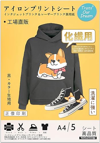 TransOurDream真正の転写シート 化繊生地用アイロンプリントシート A4 5枚 インクジェット&レーザープリンタ兼用 布用 綿100%の生地