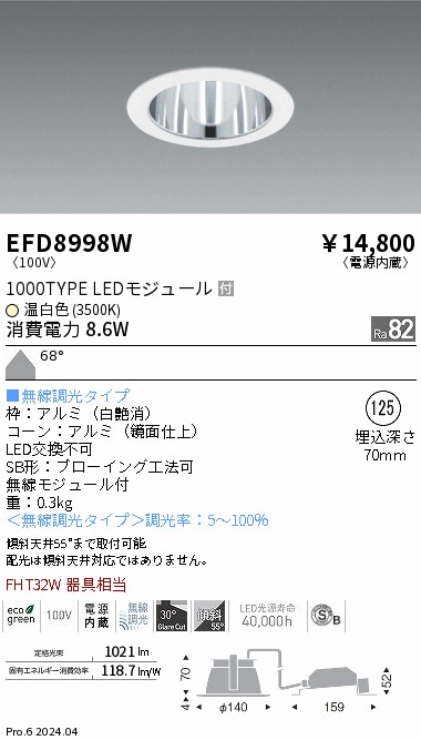 遠藤照明 EFD8998W ベースDL_Φ125鏡面枠白_1000タイプ3500K_拡散