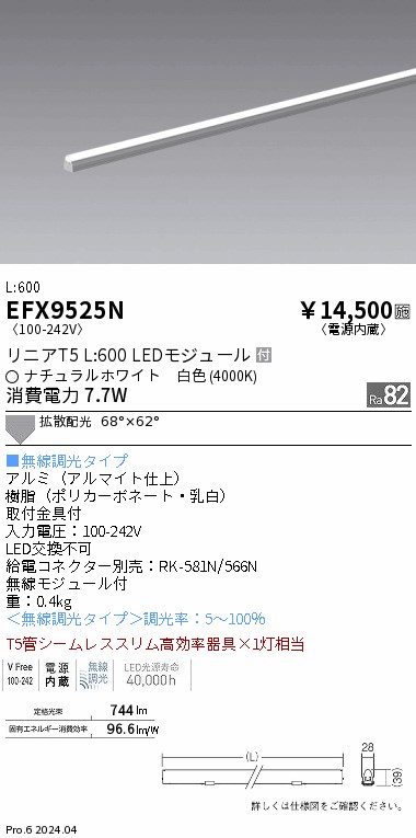 遠藤照明 EFX9525N リニアT5 L600タイプ 4000K Fit
