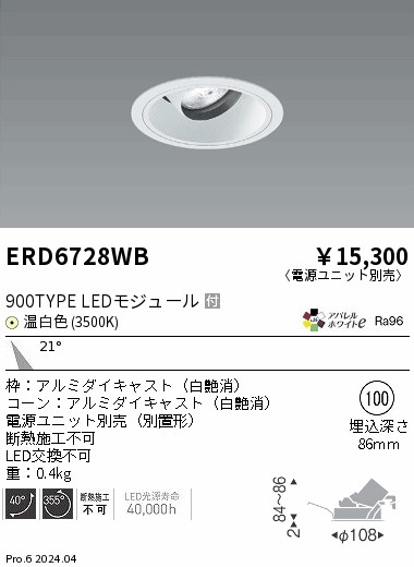 遠藤照明 ERD6728WB COBユニバDL白コーン 900タイプ 3500K 中角