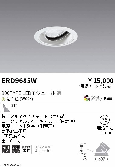 遠藤照明 ERD9685W COBユニバーサルDL 900タイプ 3500K W