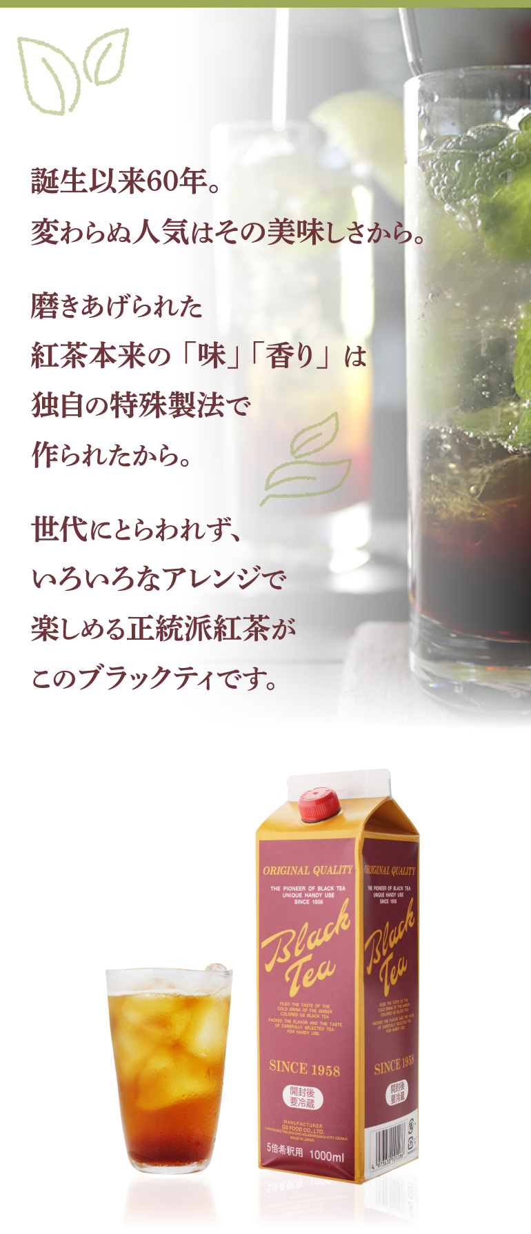 GSブラックティー加糖は、5倍希釈用濃厚紅茶です。磨き上げられた紅茶の色・味・香りを大切にして抽出し、瓶詰めにしました。