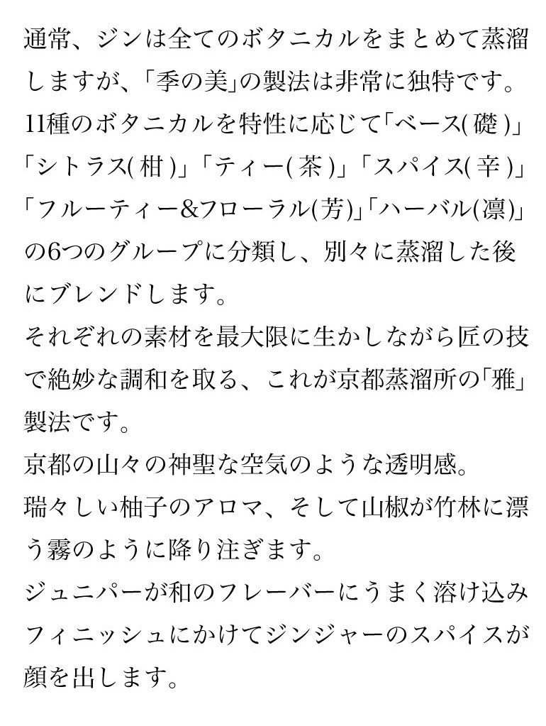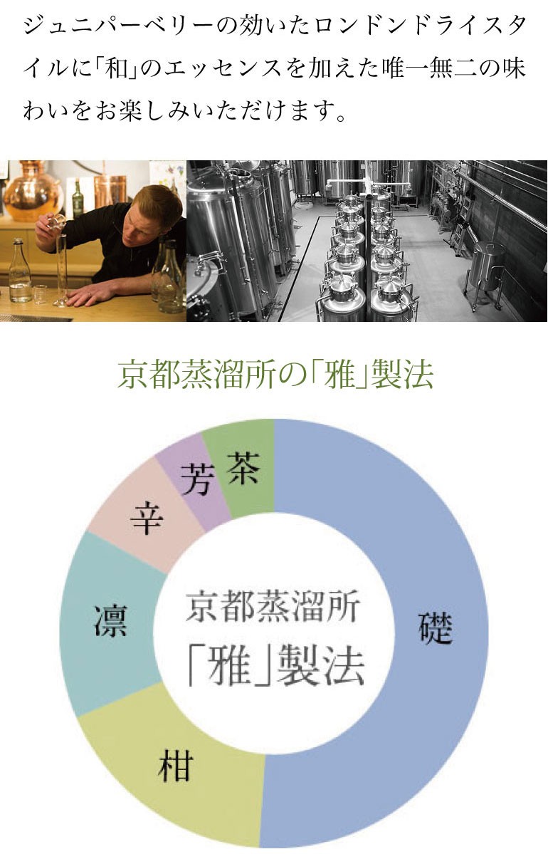 ジュニパーベリーの効いたロンドンドライスタイルに「和」のエッセンスを加えた唯一無二の味わいをお楽しみいただけます。