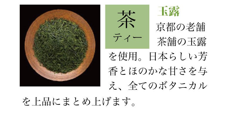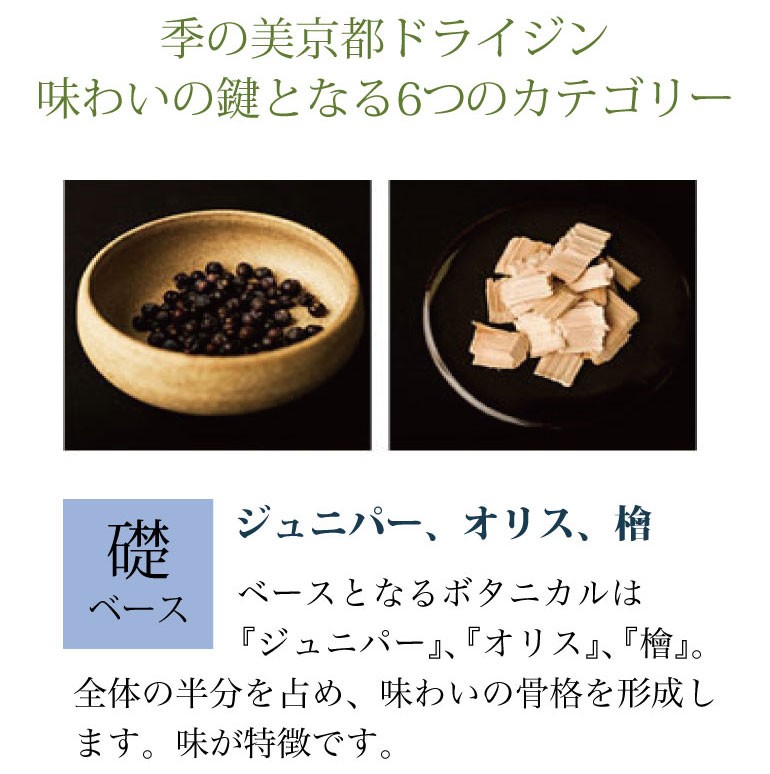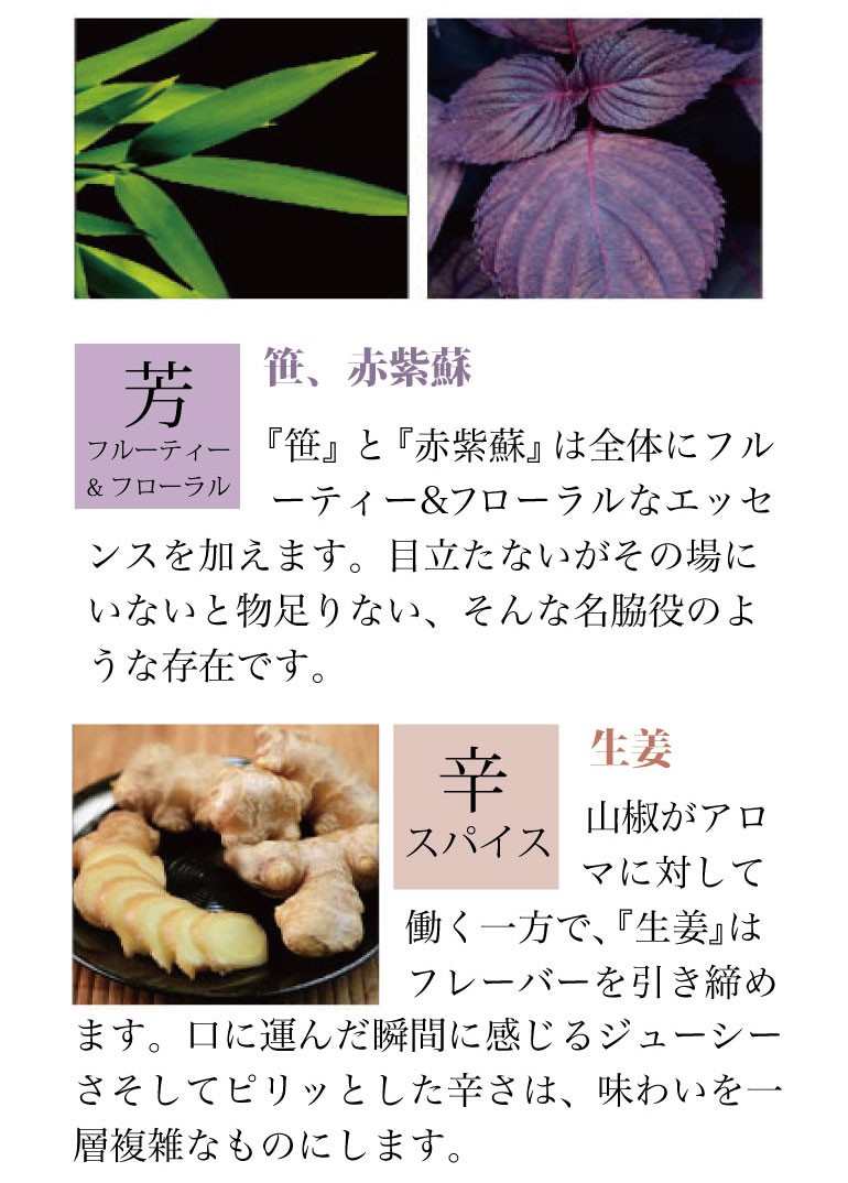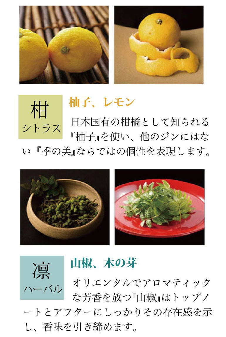 ボタニカル ジュニパーベリー、オリス、赤松、柚子、レモン 、緑茶(玉露) 、生姜 、赤紫蘇、笹の葉、山椒(実)、木の芽