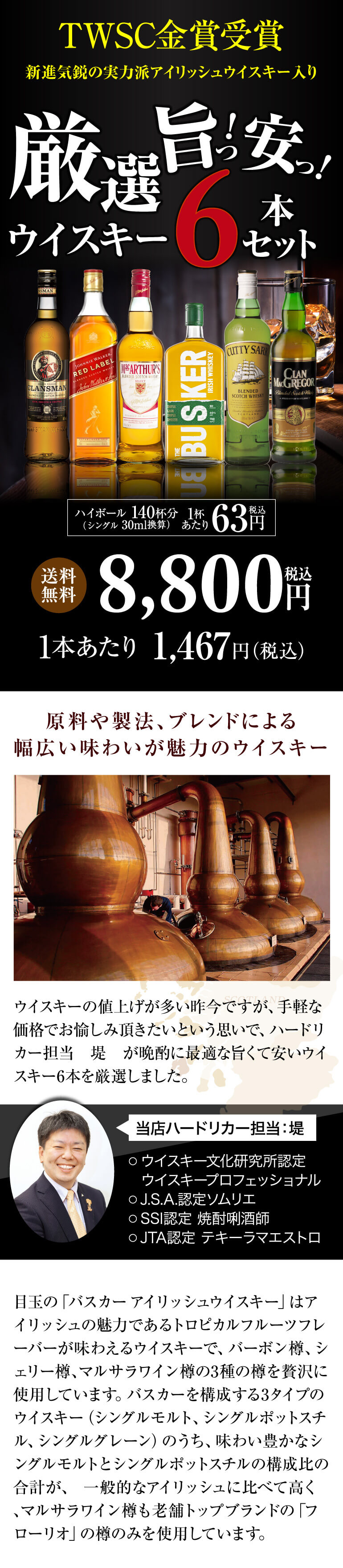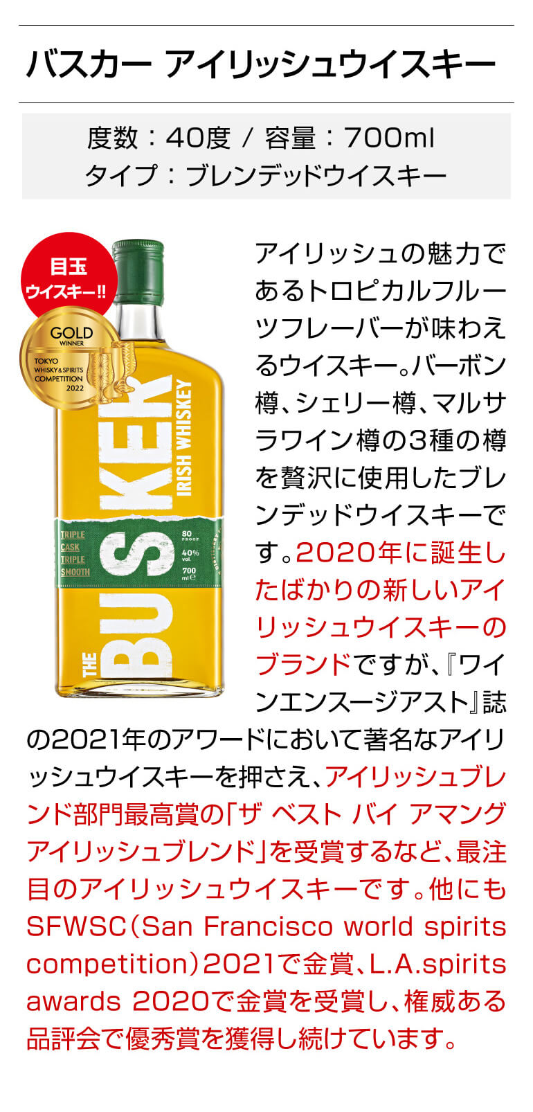 新進気鋭のアイリッシュウイスキー「バスカー」をはじめ、厳選旨安ウイスキーを6本セットにしました。
