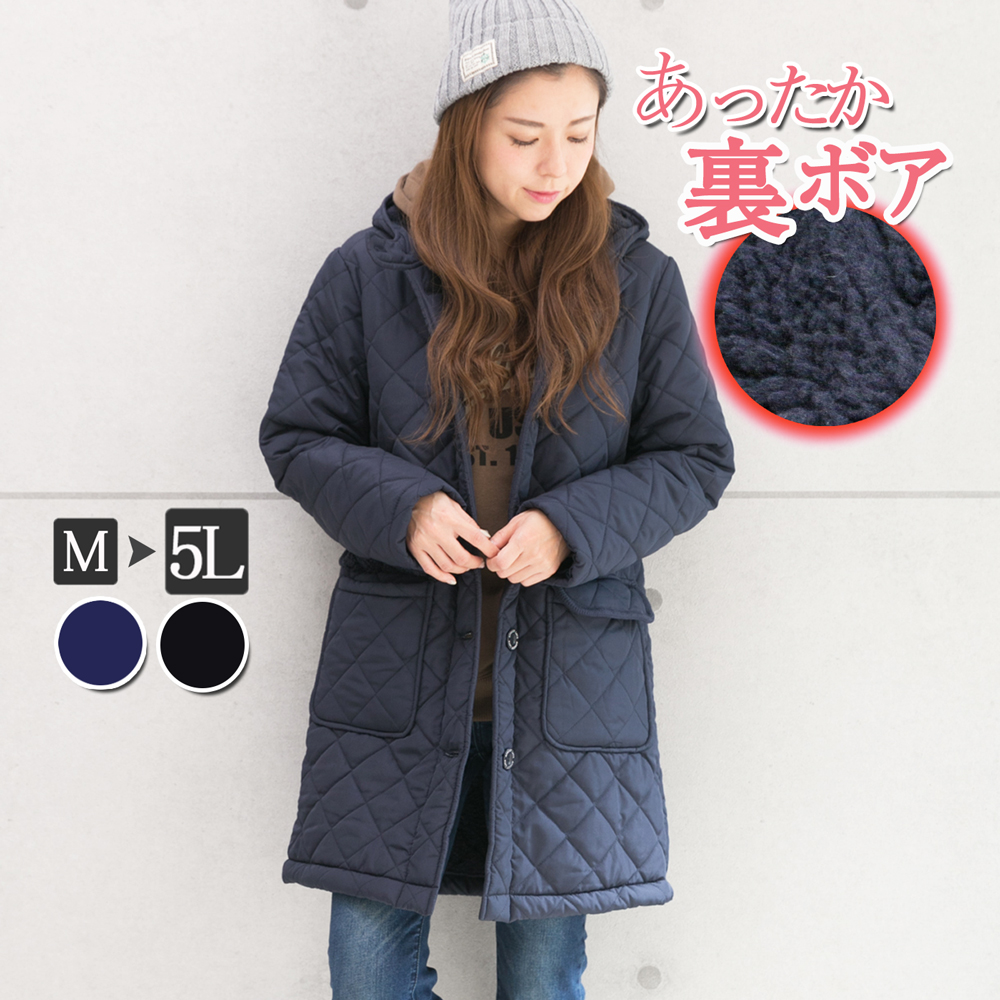 キルティングコート レディース 裏ボア アウター 秋 冬 キルティング コート ロングコート 防寒 中綿コート ベンチコート M L LL 3L 4L 5L 大きいサイズ