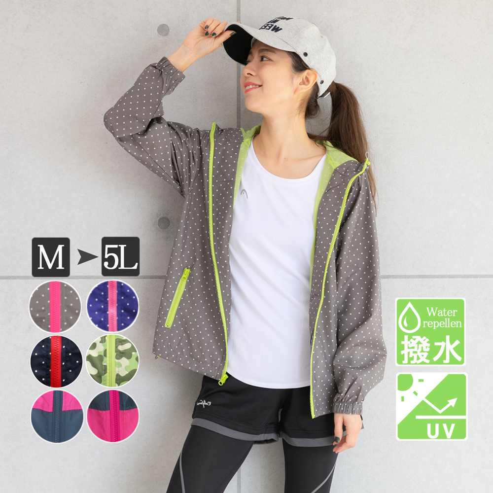 ・水玉柄や無地の配色が可愛いフード付きナイロンパーカー、裏地がメッシュでゆったりサイズまでラインナップ
