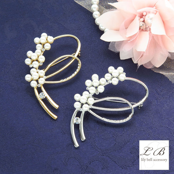 小粒パールの花モチーフが愛らしいエレガントブローチ。 ダブルの細リボン風デザインにはラインストーンがあしらわれ、華やかさもプラス☆ 入学式や卒業式などのフォーマルシーンはもちろん、普段のちょっとしたオシャレにもオススメです。