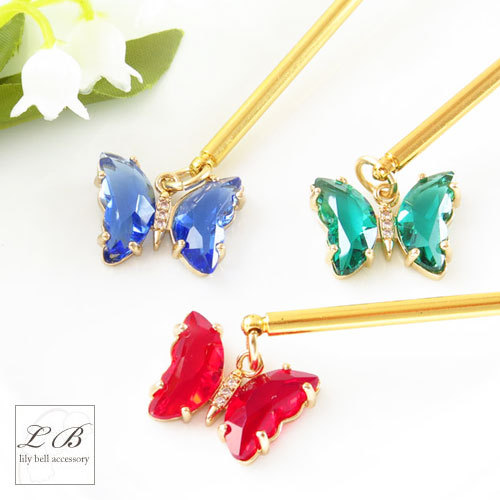 かんざし(ojs123)オリジナル きらきらガラス蝶々バタフライ 夜会巻き一本スティック簪