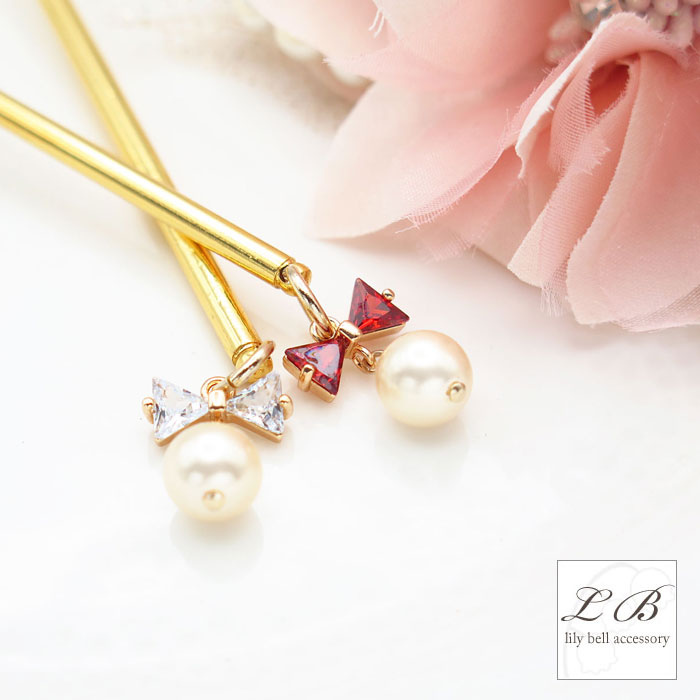 可愛らしいキュービックジルコニアのリボンチャームが揺れる一本かんざし簪。 リボンの下には艶やかなパールがさりげなく揺れ、上品さもプラス☆ 小さめモチーフですので、普段のオシャレにお勧めです♪