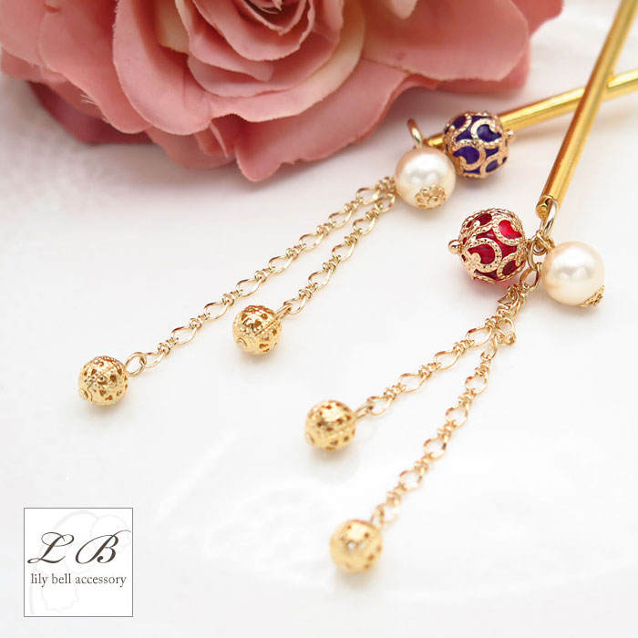 ゴールドラインボール揺れる一本かんざし簪。 エスニック感ただようカラーボールと艶やかパールで、アップスタイルに妖艶さをプラス☆ ゆらゆらと揺れるゴールドタッセルが可愛らしい印象を与えてくれます。