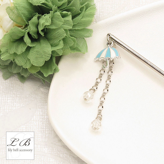 爽やかなブルー×ホワイトのバイカラー傘モチーフが揺れる可愛らしい1本かんざし簪。 傘の下ではまるで雨粒のようにクリアガラスストーンがゆらりと揺れます♪ 雨の日でも気分が上がるおすすめのアイテムです☆