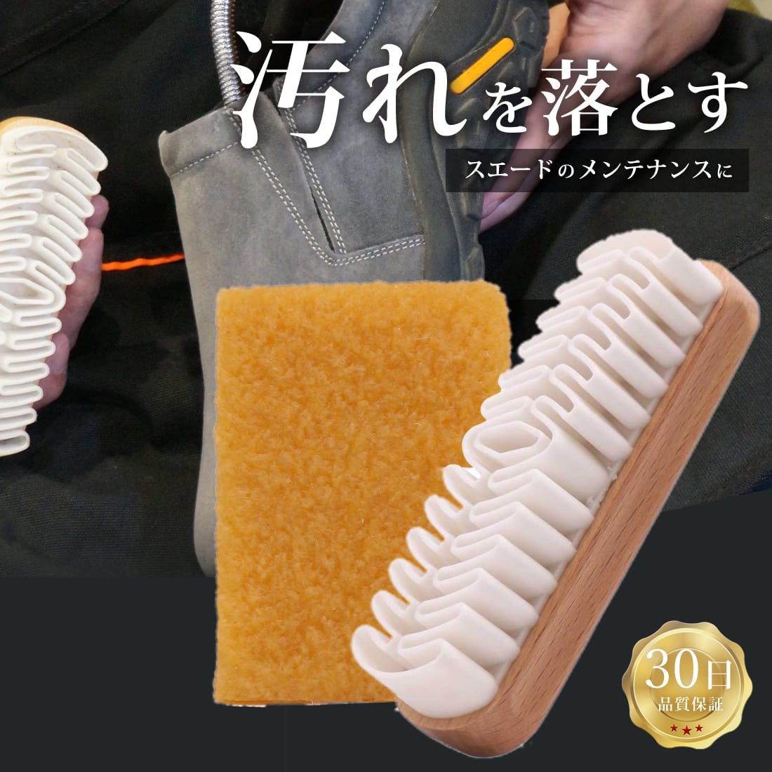 | 【 簡単に汚れが落ちてビックリ 】 クレープブラシとゴムクリーナーがあればスエードのメンテナンスが簡単にできます。ニューバランスやスニーカー全般はもちろん、メレルのジャングルモックやヌバックのティンバーランドにもオススメ! 【 クレープブラシの使い方 】 クレープ状のゴムブラシで起毛革の汚れを付着させ取り除きます。一方向だけでなく、毛を起こすよう四方にブラッシングする事がポイントです。綺麗に見える靴でもブラッシングするとごそっと汚れが取れます。汚れたまま白いスニーカーをブラッシングすると逆に汚れが移ってしまう事があります。汚れたら定期的に水洗いをしましょう。 【 ゴムクリーナーの使い方 】 クレープブラシで取れなかった汚れや、ソールの汚れをゴムクリーナーで落としていきます。特にソールについた頑固な汚れはゴムクリーナーで擦る事でとても綺麗になります。天然ゴムを100%使用しているのでとても柔らかく汚れを付着しやすくなっています。擦っていると消しゴムのように汚れがポロっと落ちていきます。カットして細かい所用に使うのもお勧めです。 【 専用クリーナーを使う理由 】 一般的に使われる馬毛、豚毛ブラシでは埃を落とす事はできても汚れを落とす事はできません。またスエードは「革を毛羽立たせる」のが正しいメンテナンスとなります。毛並みが一方向に整うことで見違えるように綺麗になるのですが、一般的なブラシでは毛を起こす事が難しいので専用のブラシを使う必要があります。 【 起毛革の素材に対応 】 スエード、ヌバックなど起毛革のメンテナンスに最適です。ゴムクリーナーはその特性を活かしてレザークラフトで使う接着剤の除去にも使用されます。状況に応じてクレープブラシとゴムクリーナーを使い分けることで多用途にわたりメンテナンスが可能です。 |