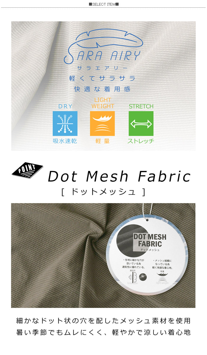 細かな穴が空いたドットメッシュのポリエステル100%素材を使用。