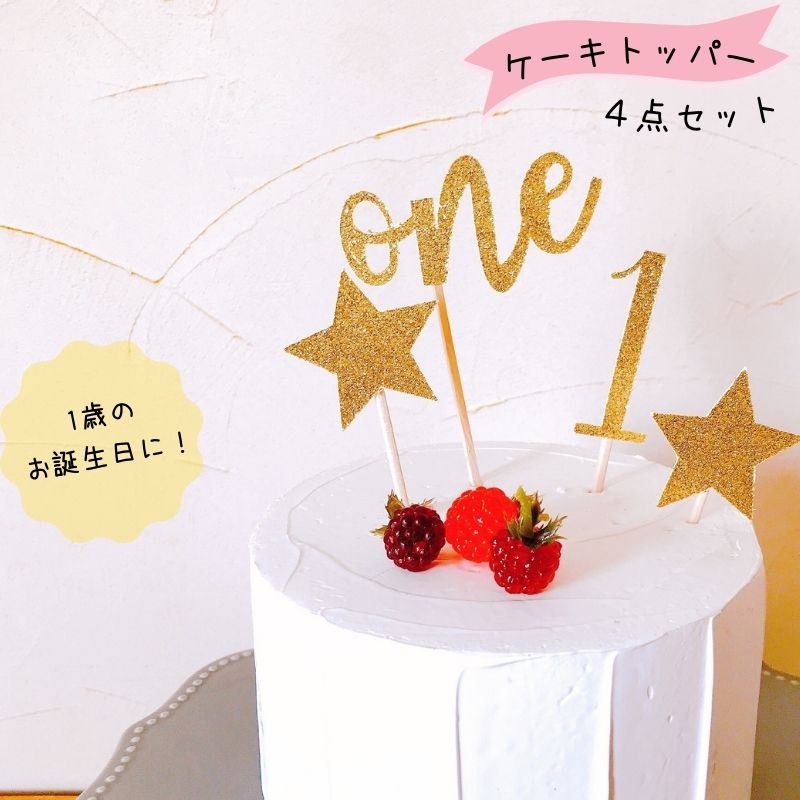 ケーキトッパー 数字 4点セット one 1 スター 星 ケーキ 飾り ケーキデコレーション 1才 1歳 一才 一歳 ファーストバースデー 誕生日 紙製TP one1ss-GD