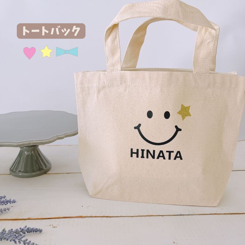 名入れ トートバッグ スマイル 名入り トートバック ワンポイント かわいい おしゃれ 出産祝い 出産準備 誕生日 バースデー プレゼント ギフト 内祝い 贈り物 プチギフト ベビー 赤ちゃん 男の子 女の子 キッズ 卒園 記念品 母の日 父の日 敬老の日 おでかけ ランチバッグ サブバッグ 小さめ コットン オリジナル