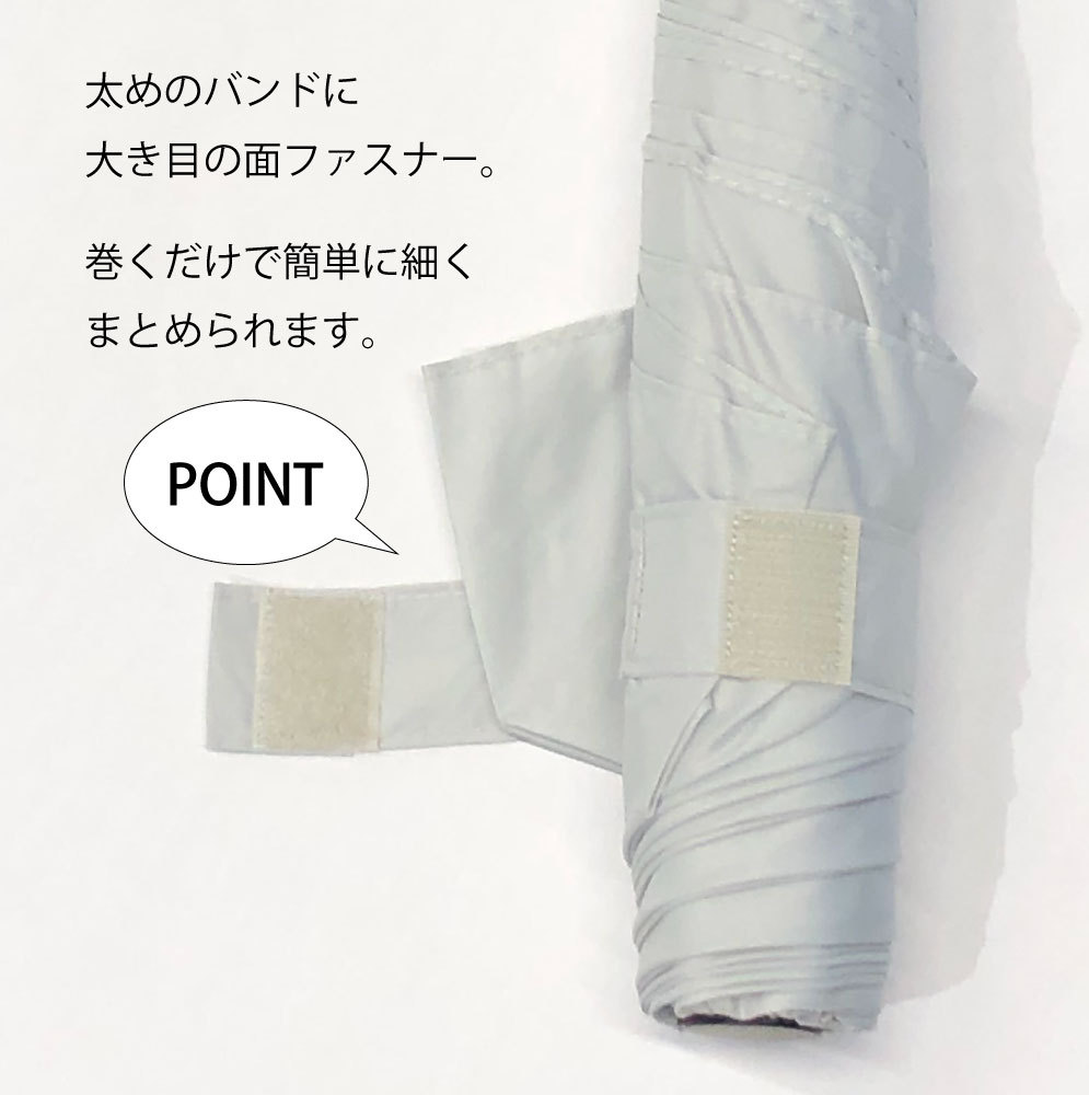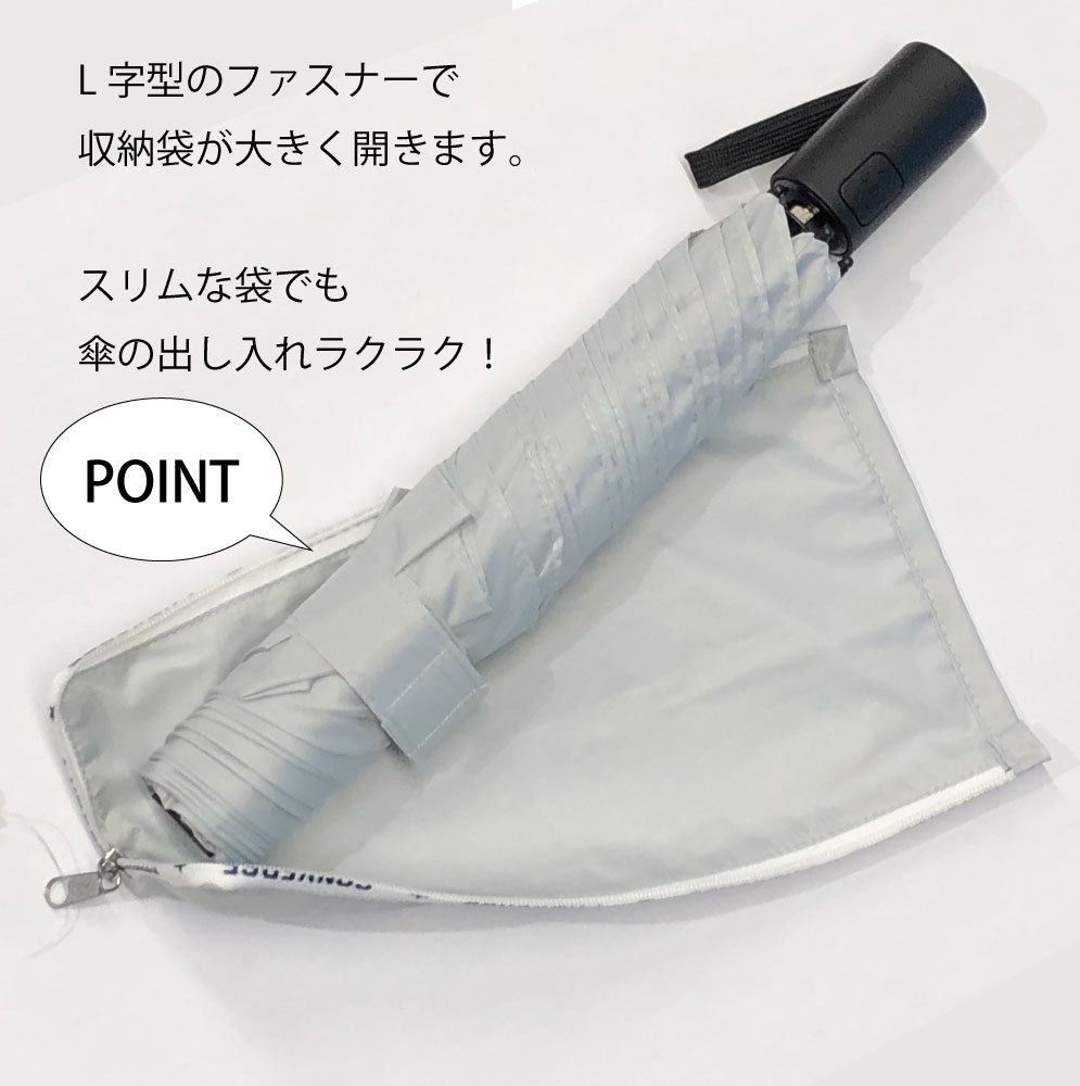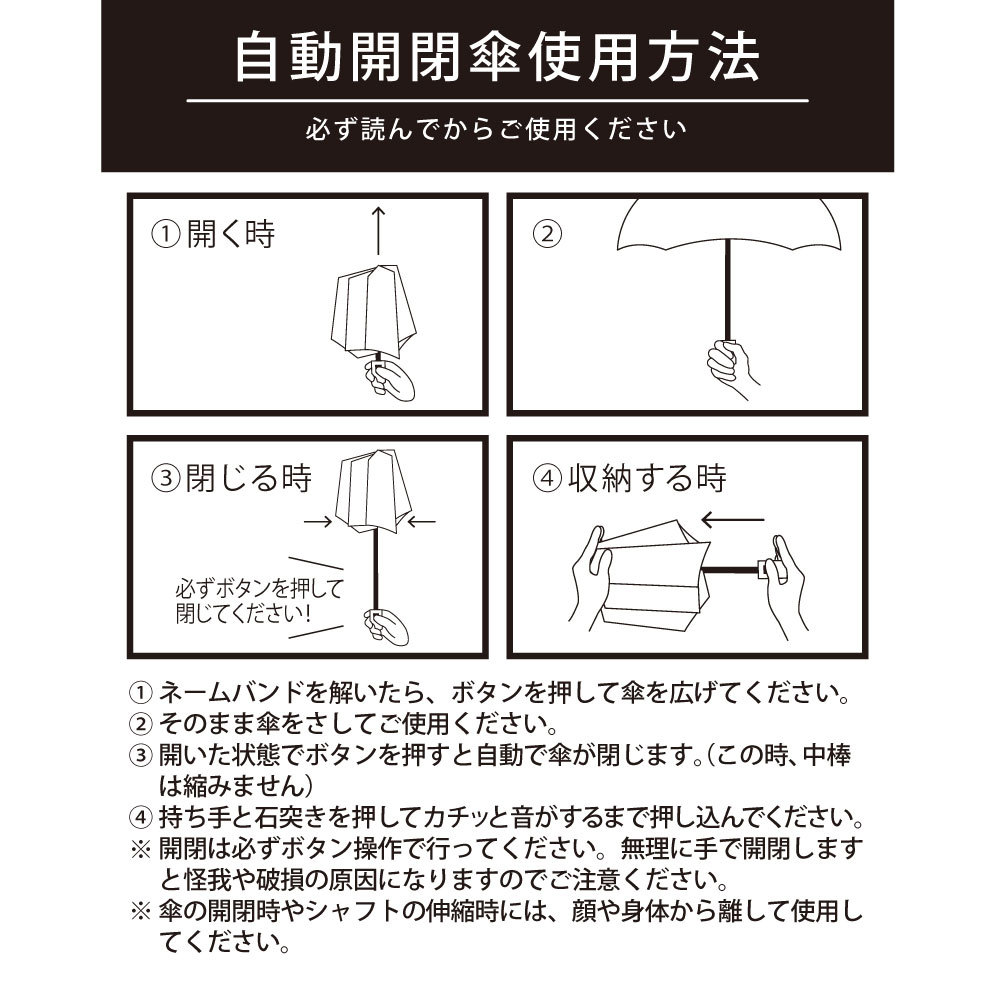 シンプルな無地の雨傘にワンポイントのブランドロゴ入り。コンパクトな自動開閉式折りたたみ雨傘。
