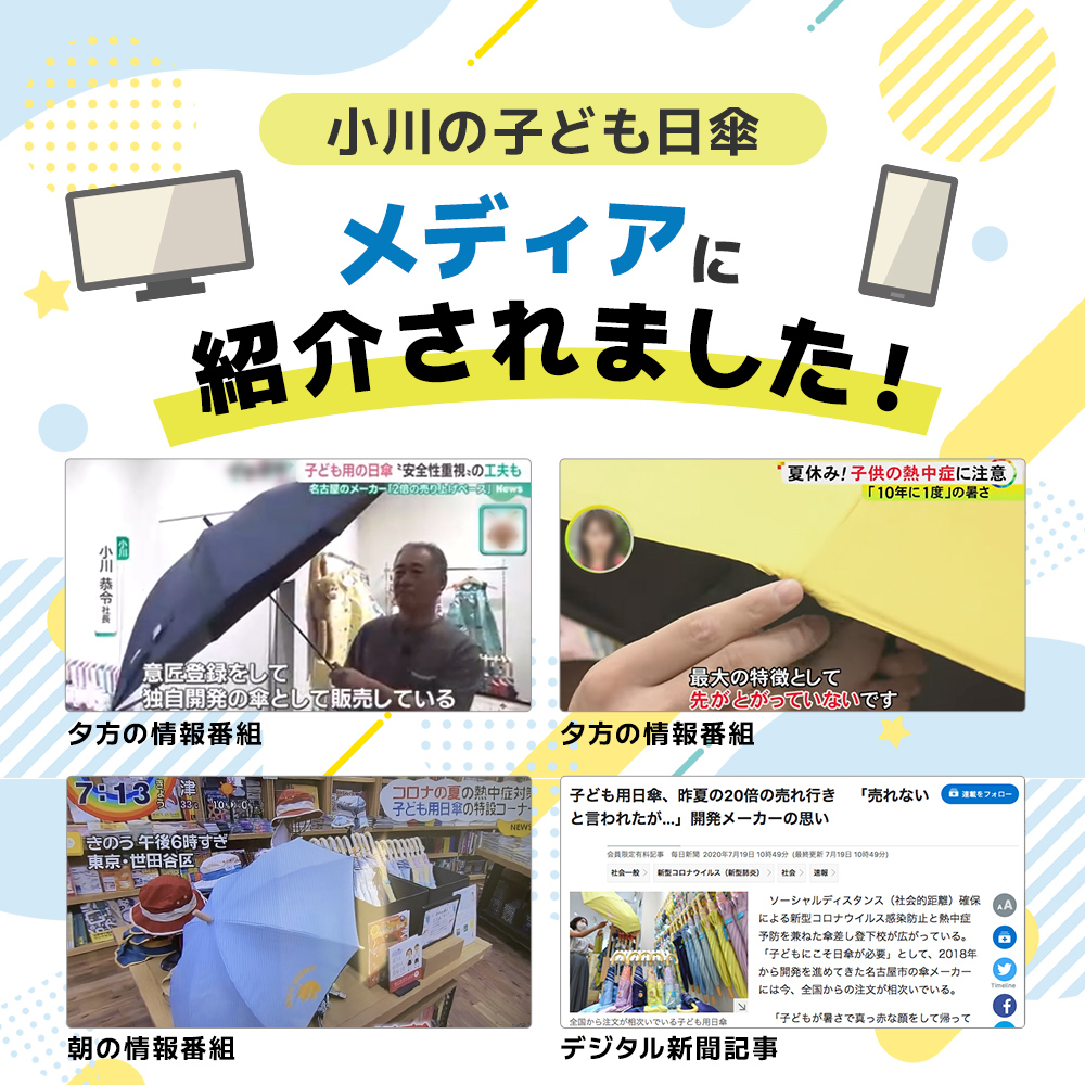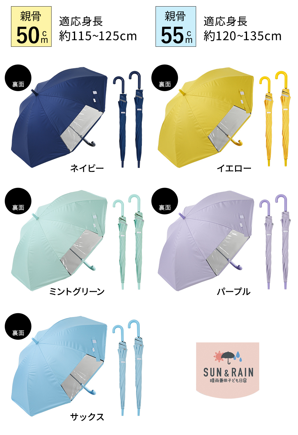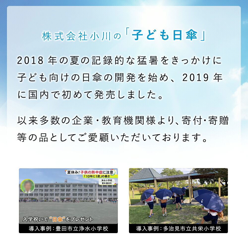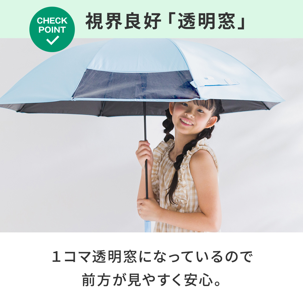 熱中症・熱射病になりやすい子どもに、サイズの合った子ども用の日傘を。紫外線・赤外線・光を遮る特殊加工で、子どもを夏の危険から守ります。日傘としてはもちろん、雨でも使える晴雨兼用タイプで、使い分けるわずらわしさはありません。前が見えやすい透明部分もポイント♪