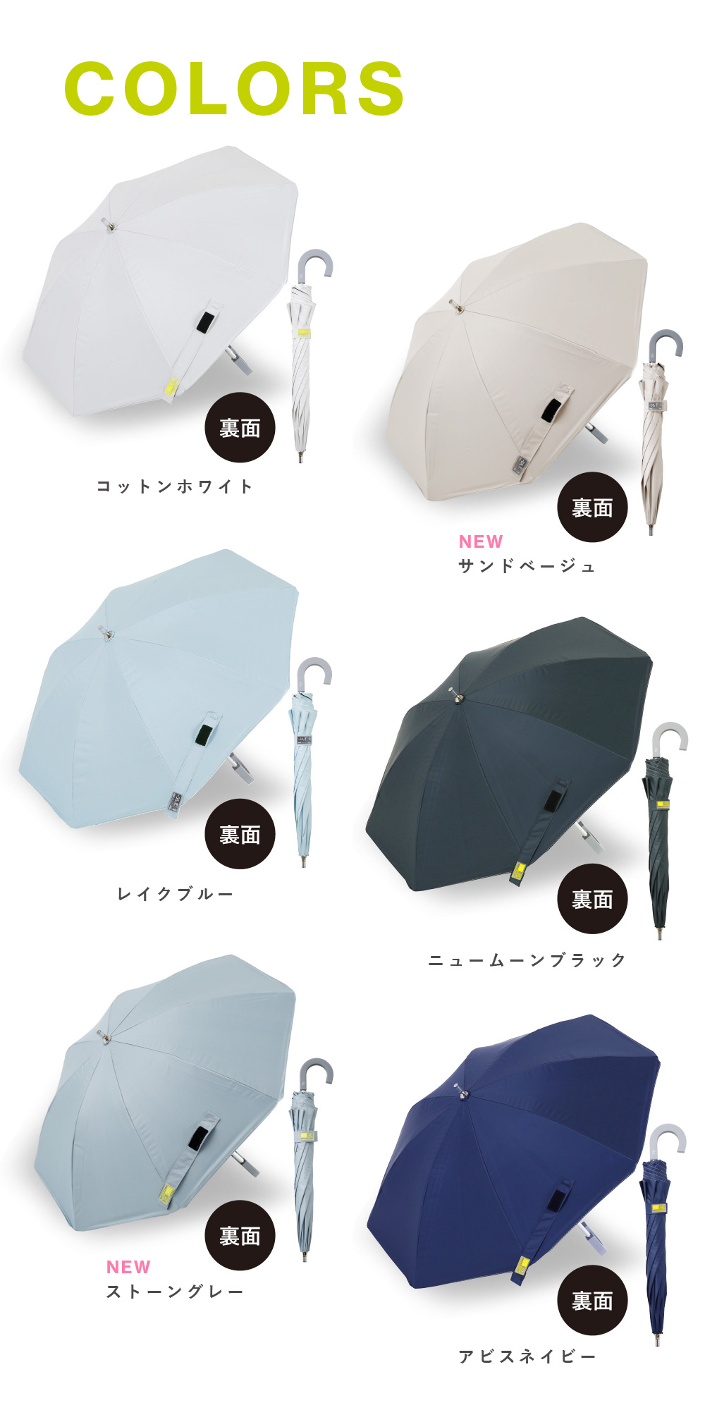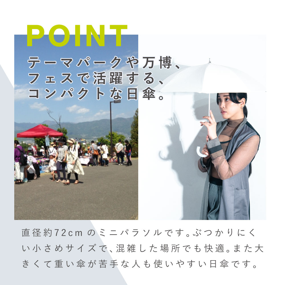 | 人気イベントの長い行列や屋外の観客席など、人が密集した場所で広げても周囲の迷惑になりにくい、省スペースなミニパラソルです。露先が飛び出していない特殊な部品を採用しました。お子さまや小柄な女性など、大きくて重い傘が苦手な人にも使いやすくなっています。手元が伸縮するショートスライド式。 |