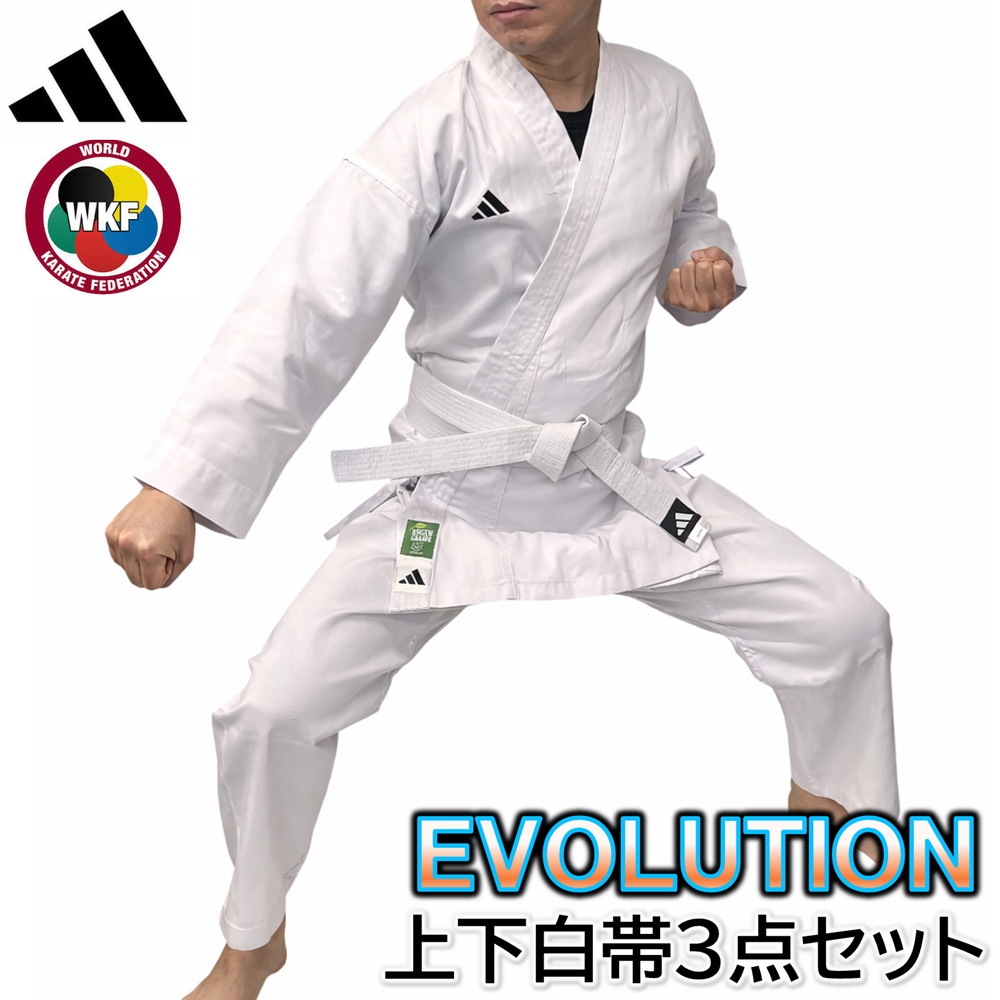 アディダス 空手 空手衣 サイズ調整可能 WKF公認 エボリューション 上下セット 白帯付 空手着 3点セット 初心者 入門者用 adidas Evolution KARATE K200E-WB
