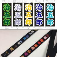 (完成した黒帯にあと刺繍加工する、裏抜けありのふち付き文字は、