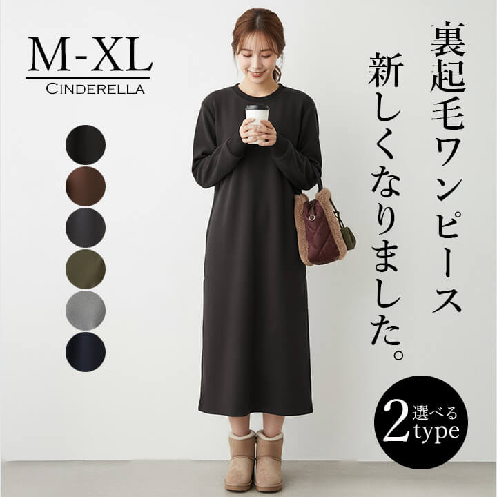 UネックとVネックから選べる裏起毛ワンピース。