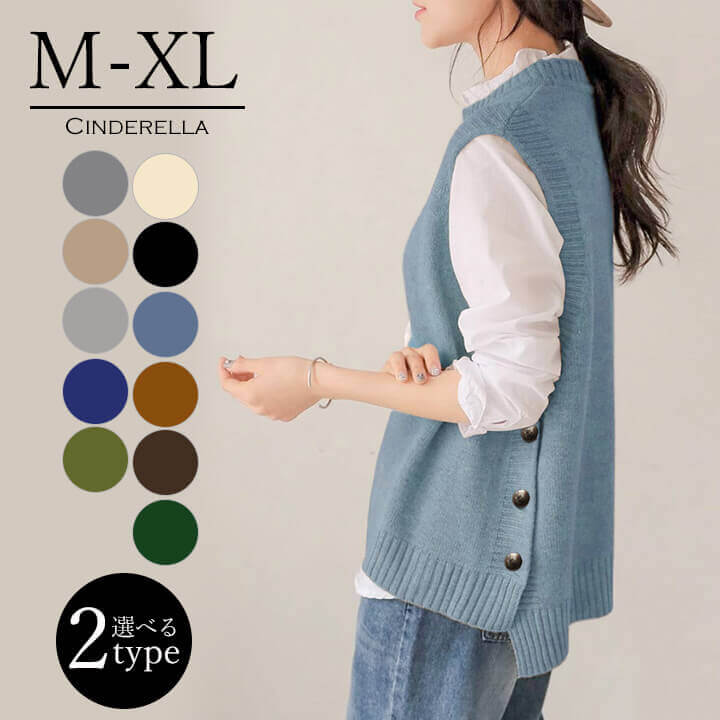 ニットベスト Uネック Vネック サイドボタン ベスト スリット アシンメトリー シンプル 厚手 冬 ゆったり 20代 30代 40代 大人 ママ レディース 黒 青 青 茶色 緑 灰色 紺 カーキ 50代 10代 60代 春 秋 冬 秋冬 服装 おしゃれ かわいい きれいめ 上品 無地 シンプル