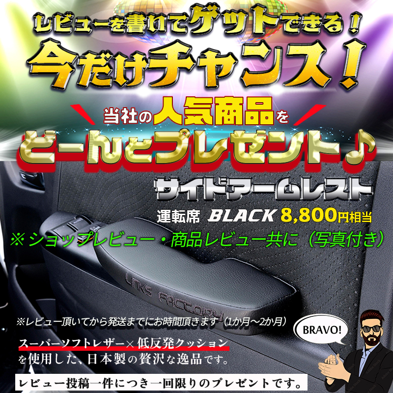 商品レビュー(写真付き)、ショップレビューを書いていただいた方に人気商品サイドアームレスト運転席(ブラック)¥8,800円をサービスいたします。