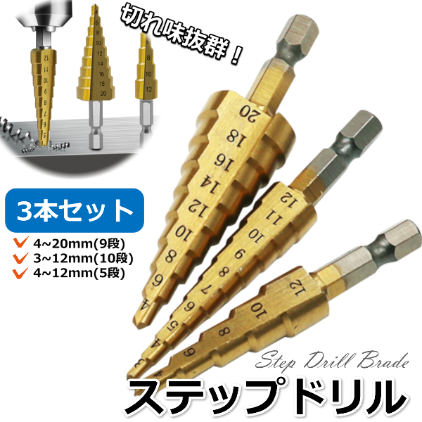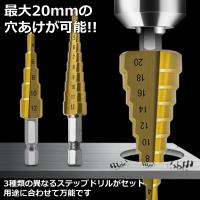 ステップドリル ドリルビット 3本セット ステップドリルビット チタン 穴あけ ステンレス 刃 六角軸