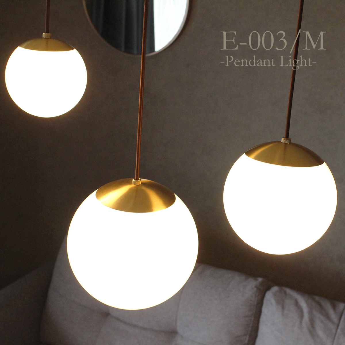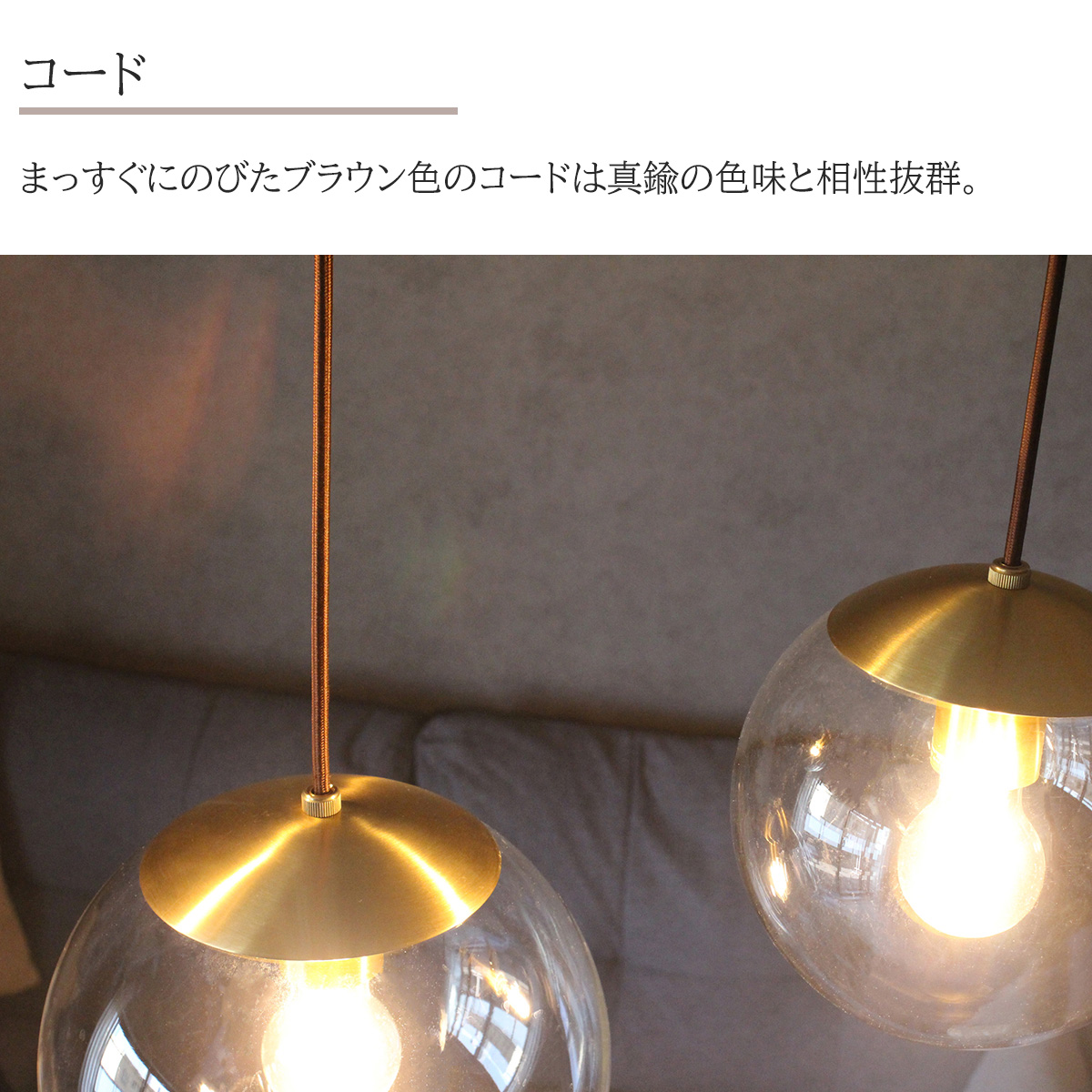 美しく輝く真鍮・まっすぐに伸びたブラウン色のコード・透明度の高いクリアガラスと純白なホワイトガラス。