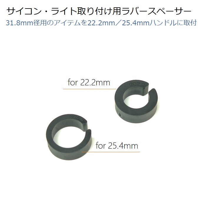 ◆サイコンマウントやライト用ブラケットなど、ロードバイクのハンドル径31.8mm用に作られたアクセサリを22.2mm、25.4mmハンドルに装着するために使用するラバースペーサーです。