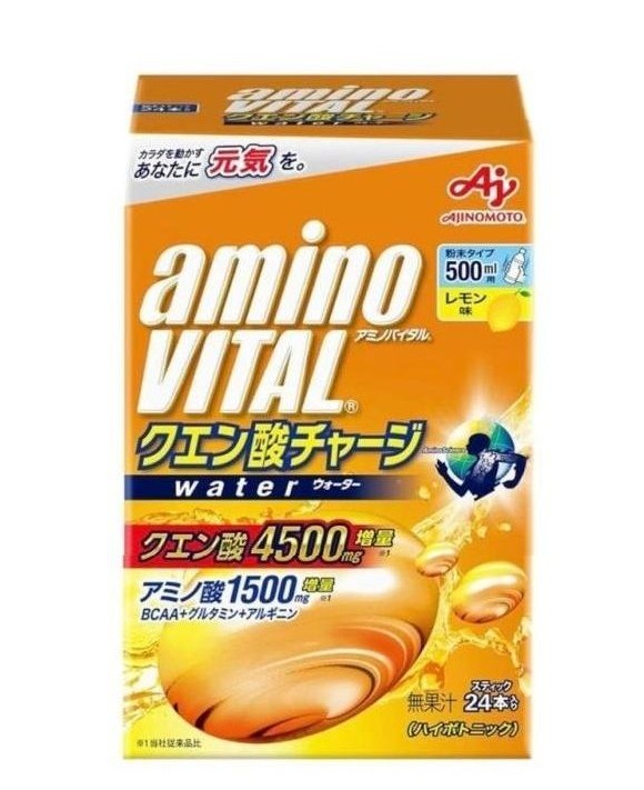 【アミノバイタル クエン酸チャージウォーター 箱の原材料】果糖(アメリカ製造)、食塩/クエン酸(Na)、グルタミン、アルギニン、ロイシン、乳酸Ca、リン酸K、V.C、イソロイシン、バリン、甘味料(アスパルテーム・L-フェニルアラニン化合物、アセスルファムK)、貝Ca、塩化K、香料、V.B2、調味料(アミノ酸等)【栄養成分】1食(11.8g)あたりエネルギー:39kcal、たんぱく質:1.5g、脂質:0g、炭水化物:9.3g、食塩相当量:0.7g、アミノ酸:1.5g(ロイシン:0.34g、イソロイシン:0.09g、バリン:0.09g、グルタミン:0.49g、アルギニン:0.49g)、クエン酸4500mg【アレルギー物質】記載なし