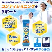 アミノバイタル BCAA アミノ酸 アクティブファインの原材料グルタミン、ロイシン、イソロイシン、バリン、シスチン、酸味料、ショ糖脂肪酸エステル、甘味料(アスパルテーム・L-フェニルアラニン化合物)、貝Ca、香料、ナイアシン、パントテン酸Ca、V.B6、V.B1、V.B2、V.A、調味料(アミノ酸等)、V.D、V.B12【栄養成分】製品(2.48g)当たりエネルギー:9.6kcal、たんぱく質:2.2g、脂質:0.05g、炭水化物:0.1g、食塩相当量:0.04g、ビタミンA:126μg、ビタミンB1:0.6mg、ビタミンB2:0.5mg、ビタミンB6:0.5mg、ビタミンB12:0.7μg、ナイアシン:3.3mg、パントテン酸:0.8mg、ビタミンD:1.1μgアミノ酸:2.2g(ロイシン:0.62g、イソロイシン:0.31g、バリン:0.31g、グルタミン:0.77g、シスチン:0.18g)【規格概要】内容量:148.8g(2.48g*60)【保存方法】高温を避け常温にて保存ください。【原産国】日本【ブランド】アミノバイタル(AMINO VITAL)