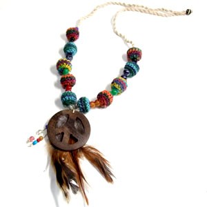 ウッド製のピースマークとカラフルなボール、またワンポイントの羽が良く合っているネックレスです。胸元に存在感がだせるので、オシャレの演出にはもってこいのネックレスです。
