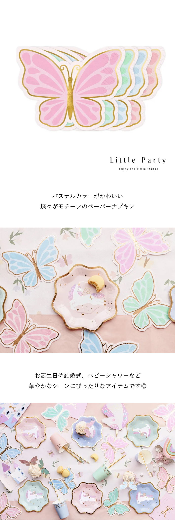 パステルカラーがかわいい蝶々がモチーフのペーパーナプキン。お誕生日や結婚式、ベビーシャワーなど華やかなシーンにぴったり◎