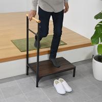 手摺付きなので玄関での上り下り時足腰の負担を和らげます。下には靴が収納できます。天板は、すのこ状になっているので滑りにくいです。アジャスター付きなのでがたつきなく置けます。