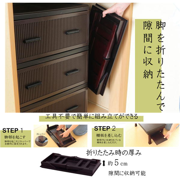 用途にあわせて使える折りたたみ可能なテーブルです。使わない時は棚板を脚部内に収めて折りたためます。天板は桐製で軽くて持ち運びも簡単で 収納時に場所をとらない便利なテーブルです。