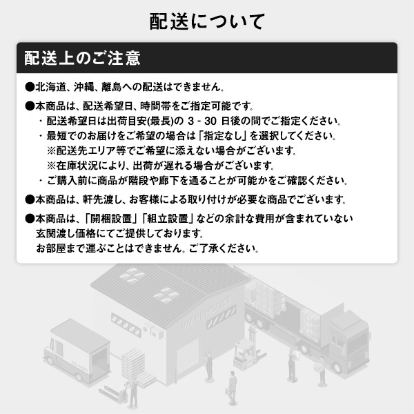 ・配送は全て玄関先でのお渡しとなります。配送員による室内への搬入・組立てはお受けできかねます。