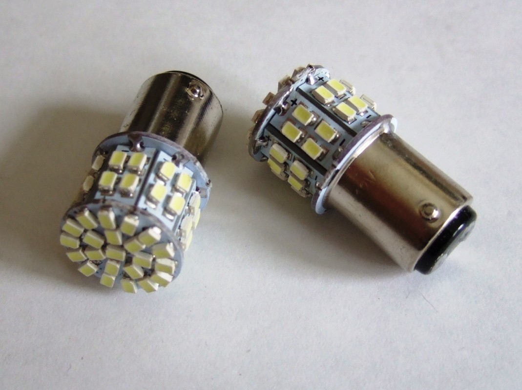 SMDーLED 50個搭載のLEDテールランプ/ストップランプ のダブル球のバルブです。周辺と後方にSMD LEDが搭載されているので全方向に明るいです。