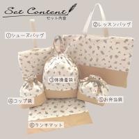 レッスンバッグ・シューズバッグ・体操着袋・お弁当箱・コップ入れ・ランチマットの6点セット。